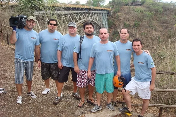 Amanheceu o dia e partimos todos tensos para gravar. Apenas os canoístas desafiaram as corredeiras 5 e 9 que eram as mais perigosas. EU caí 2 vezes do bote em 2 cachoeiras mas tínhamos a frente uma de nome “THE MOTHER”. Pelo nome vocês já imaginam o que teríamos que enfrentar. Nosso guia avisou a chegada da “GRANDE MÃE”! Ficamos uns 15 minutos, dentro dos botes, organizando a nossa descida por essa corredeira. Já estava ficando tarde e tínhamos que acampar e passar a noite a beira do rio após a 22ª corredeira . Só pensávamos em acabar logo com aquilo. Iniciamos a descida vagarosamente. Começamos bem, todos remando e obedecendo as ordens no nosso guia, mas de uma hora para outra o bote escalou uma onda inacreditável, por uma pedra enorme no meio do rio. O bote subiu a proa de uma tal maneira que o 1º a despencar em cima de mim foi o @claytonconservani. Daí em diante foi terror e pânico! Um verdadeiro strike e o bote virando, emborcando de cabeça pra baixo. Já no fundo eu só ouvia as borbulhas e os gritos dos companheiros. O saudoso irmão e mago das imagens Ari Júnior, não nadava bem e segurou o nosso “Macgiver” pela cintura, o Cláudio Carneiro, que afundava impiedosamente a cada grito do Ari. E já na flor d’água descendo o rio em velocidade eu ouvia o @claudiocarneiro gritar:”…me larga Ari! Me larga!” Eu ria de nervoso já de braços cruzados descendo a corredeira em alta velocidade. O Ari no desespero tirou o relógio e as botas e largou na corredeira, e ficou pra trás. Chegamos no remanso e nos lembramos dos crocodilos. Imaginem 6 cabeças tentando subir num bote ainda emborcado que o nosso guia não conseguia desvirar? Foi terror um terror com todos tentando subir ao mesmo tempo num bote virado e com as perninhas dentro d’água e o guia pedindo calma! Tenho a certeza que em nossas mentes somente pensávamos nas mandíbulas de um crocodilo.