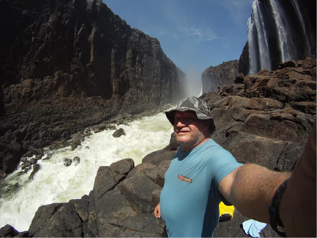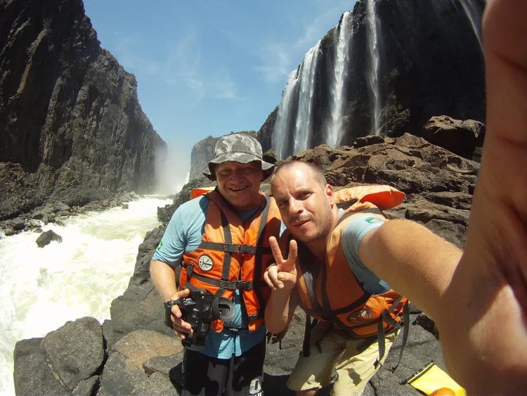 Foi sem dúvida uma das maiores experiências que vivemos. O rio Zambeze tem vários níveis de dificuldade para os canoístas do mundo inteiro. O Maracanã está pra o futebol assim como o rio Zambeze está para o caiaque. É a Meca do esporte! Além das corredeiras muito perigosas existem os remansos, que são os espaços entre as cachoeiras. São os locais preferidos dos crocodilos! Anualmente, o governo do Zimbabwe faz uma varredura para retirar os maiores crocodilos, mas nem todos são retirados. Todas as 22 corredeiras tem nomes e numa reunião com o nosso guia ficou decidido que não iríamos encarar 2 cachoeiras por conta do perigo. Iríamos retirar os botes do rio e margear até um pouco depois dessas 2 corredeiras pois eram perigosos para o rafting.